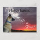 A mensagem neste cartão-postal diz, "Felz pascoa! Ele é Risen!" com a referência da escritura de Matthew 28:6. Este cartão-postal Páscoa encantador mostra o meu German shepherd bonito, olhando em direção a um incrível pôr do sol da Califórnia rico em cores vermelha, laranja e amarela. As colinas rolantes são quase negras e o céu está cheio de nuvens escuras e de tempestades leves. Este é um cartão postal perfeito para todos.