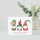 Cartão postal simples, ao estilo nórdico, com três gnomos de Natal giros, escandinavos, com chapéus e tunicados vermelhos e verdes sazonais. Na frente, personalize seus "Felizes Feriados, "Feliz Natal", etc., saudando e chamando a coordenação da tipografia vermelha. Ao contrário, personalize seu feriado pessoal e a mensagem de feliz ano novo.