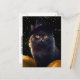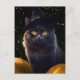 Bonito gato preto com olhos ouros veste um chapéu de bruxa com estrelas no fundo e abóboras. Um cartão postal de Feliz Halloween.
