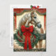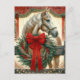 A agricultura bonito personalizou o cartão postal de Natal. Cavalo bonito âmbar e branco de aquarela no dorso de uma cerca de madeira rústica e uma coroa bonito com arco vermelho. O fundo é um celeiro rústico vermelho, todo escondido em decorações de Natal.
