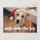 Cartão-postal de Natal bonito, com o tema de um cão, com a fotografia horizontal do seu cão na frente, com "liberte a alegria", apresentado em letras brancas a negrito. Personalize o cartão de Natal de foto do cão adicionando uma saudação personalizada e seu nome. O cartão postal reverte para exibir seu endereço de devolução e mensagem personalizada.