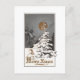 Um Feliz Natal Uma lua ouro está brilhando sobre casas cobertas de neve e árvores neste cartão postal de natais vintages de 1910.