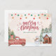 Este charmoso cartão postal de Natal apresenta uma bela ilustração aquática de uma festiva cena de inverno, completada com um clássico carregando vermelho de uma árvore de Natal, uma confortável casa coberta de neve, e um alegre boneco de neve. As cores quentes do feriado vermelho e verde, combinadas com ornamentos pendurados e flocos de neve delicados, tornam esta design perfeita para enviar saudações sinceras a amigos e familiares. Espalhe a alegria da temporada com este maravilhoso cartão postal de feriado.
