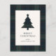 Cartaz de Natal moderno, com design eterno com árvore de Natal com um padrão de xadrez azul e marinho verde mudo juntamente com a saudação "Feliz Natal". Use a modelo para adicionar sua mensagem personalizada.