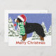 Feriado Festivo de Natal Personalizado Cão de Montanha Bernese vestido com chapéu santa e cachecol verde e branco segurando enfeites de natal vermelha em sua boca. Inverno de neve. Cartão postal de natal bonito para amantes de berner!