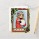O natal vintage carda mostrar uma menina envolvida acima de calorosamente com suas mãos em um muff branco da pele. Leva uma boneca e um livro e tem um sprig do azevinho em seu chapéu.