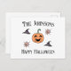 Este é um design de Halloween fofo e personalizado. Tem tendências, motivos de Dia das Bruxas e a mensagem "Feliz Dia das Bruxas" e espaço para você adicionar seu nome de família. É perfeito para o seu cartão de Dia das Bruxas, e ideal para festas ou celebrações de Dia das Bruxas. Para adicionar seu nome, simplesmente digite-o na caixa personalizar este texto. Para alterar a cor ou a fonte, faça o check-out da ferramenta de edição de design. Para obter ajuda com a personalização, produtos correspondentes ou para um design personalizado, entre em contato comigo por e-mail: ursuladawnmoon@gmail.com