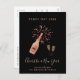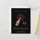 Cartão postal do Ano Novo Elegante, que comemora o final de 2020. Este design apresenta aquarelas de uma garrafa de champanhe de ouro e rosa com uma explosão de faíscas e dois copos de champanhe cheios de confete de ouro contra fundo preto. Você pode personalizar as saudações "Peace Out 2020" e "Saúde a um Ano Novo", adicionar seu nome de família e adicionar o próximo ano à etiqueta da garrafa de champanhe.