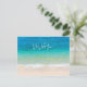 Cartões postais de Natal com cena oceânica e praia. Personalize com sua saudação e assinatura. Água azul tropical e areia de praia na frente com um texto de amostra, "nós desejamos" (mude o texto para "I", conforme necessário). O texto continua atrás com uma saudação de "Feliz Natal" e "Feliz ano novo".