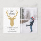 "Oh, o Natal dos veados está aqui." Aproveite esta design moderna com uma silhueta falsa de cabeça de veados de ouro. A placa também apresenta um lugar para você colocar uma foto com uma borda branca no dentro da imagem.
