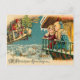 Este cartão do natal vintage caracteriza duas meninas que esperam Papai Noel que vem navigação através das nuvens em um balão de ar quente.