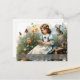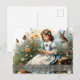 Uma jovem de vestido azul com tocas brancas senta-se num banco de madeira no meio de um jardim florescente. Ela está lendo uma pequena carta enquanto borboletas voam ao seu redor. Uma lebre e um coelho pequenos sentam ao lado dela, enquanto outras flores de primavera florescem em cores quentes no fundo. As palavras "Felz pascoa" dão à imagem um toque festivo.