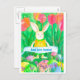 Um cartão-postal alegre e alegre para as Páscoas de férias, com um coelho doce vestido com uma camisa laranja, segurando um cartaz de mensagem num pedaço de ovos coloridos no jardim de tulipas pintado com aquarela. Você pode personalizar o texto para ajustado das suas necessidades.