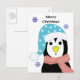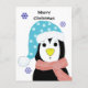 Um pinguim de Natal giro com um chapéu e cachecol de férias. Alguns flocos de neve caindo. Personalizar conforme desejado.