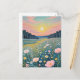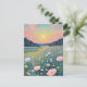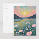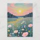 Esse trabalho de arte capta uma paisagem serena e mística ao pôr do sol, com uma qualidade de sonho que combina formas naturais detalhadas com uma atmosfera espiritual e etérea. O primeiro plano é um campo vibrante repleto de papoilas e flores silvestres moles, de cor pastel, cada uma reproduzida com um toque delicado e estilizado. Um caminho ou uma corrente sinuosa leva o olho até a distância, onde uma floresta escura e tranquila abraça o horizonte sob um vasto céu pintado em um gradiente luminoso de rosa, pêssego e chalé. Um sol pálido, cheio ou lua pendura no céu, lançando um brilho suave sobre toda a cena. A peça evoca um senso de paz, encanto, e a beleza silenciosa dos ciclos da natureza.