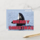 Feliz Natal no texto corajoso com as estrelas que caracterizam uma baleia de assassino residente da orca que faz um salto do espião fora das ilhas de San Juan. O interior do texto é vermelho brilhante e lê "maio a alegria da época natalícia… ao longo do ano". Verifique minha loja no dobrador do Natal