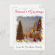 Saudações da temporada! Um design de estilo "chintzy vintage" com árvores de Natal numa pequena vila de neve, com pessoas locais a comprar e a divertir-se. A imagem fica aflita ao redor das bordas e se desintegra em um padrão que cobre a parte externa do design. Sinta-se à vontade para personalizar a saudação principal e (claro) o seu próprio nome familiar.