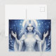 This fantasy postcard features an ethereal winter goddess with flowing silver hair and glowing halo, surrounded by snowflakes and a moonlit forest, symbolizing purity and the magic of winter. Finished as an acrylic oil paint print.