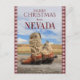 Este cartão-postal de férias apresenta uma espetacular fotografia ocidental com botas vestidas de cowboy a esportistas de um par de esporções de peso mexicano feitas por medida, completadas com letras "Yeeha" e correias de couro. O texto vermelho no topo diz "Feliz Natal de Nevada", com a NEVADA sendo feita de um padrão de xadrez de búfalo vermelho e preto. As botas estão sobre madeira em frente a uma nuvem azul cheia de céu ocidental. Uma borda vermelha e branca com flocos de neve faz o cartão festivo.