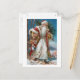 Imagem natal vintage muito bonita de Papai Noel vestida de vermelho e branco tradicionais e carregando uma árvore de Natal nas costas. Ele também tem um tambor de brinquedo, uma boneca, um cavalo de brinquedo e uma trompete. A mensagem do cartão é "Um Feliz Natal".