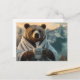 Um urso pardo vestindo um robe branco esmagado senta-se numa varanda com uma caneca 'Barly Awake' em suas patas. O vapor sai da caneca, e as montanhas são visíveis à luz da manhã suave. Esta imagem captura um momento de contentamento pacífico.