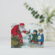 Imagem clássica do vintage do Natal de Papai Noel com um saco enorme de brinquedos que dão presentes a duas crianças pequenas quando um cão pequeno olhar sobre. A cena inteira é ajustada em uma paisagem nevado. A mensagem do cartão é "Feliz Natal".