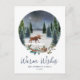 Cartaz de Natal elegante com uma cena noturna de inverno a aquarela na frente completa com um céu estrelado, belos pinheiros, um alce e neve no chão. Airelas Holly, cones de pínus e folhagem de inverno acenam a cena circular de inverno. "Desejos quentes" é exibido em um script azul escuro com seu nome e o ano mostrado abaixo. A parte traseira do cartão postal de feriado exibe o endereço de devolução e a mensagem personalizada em caracteres azuis escuros.