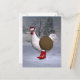 o pai natal ganhou uma galinha bonitinha como ajudante este ano - alegremente marchando com botas vermelhas e chapéu através da neve no inverno