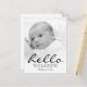Personalize este Cartão postal de anúncio personalizado de nascimento de bebê de fotografia moderno com Na moda com as suas próprias informações e a sua fotografia favorita do seu anjo. Design limpa, fresca e leve e neutra com texto Olá, perfeito para uma menina ou um bebê. *Crédito de foto de Modelo: © Eric Fleming