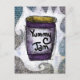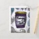 Yummy Jam apresenta um pote de geléia de mirtilo ou uva sobre um fundo pintado com formas espiraladas e triângulos fora de uma página de livro.