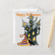 A divertida aquarela design do Halloween apresenta a casa de Halloween assombrada com chapéu de bruxa listrado e silhueta raven.