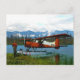 Um piloto de arbusto fica perto do seu flutuador de Havilland Canada DHC-2 Beaver na costa de um lago no extremo norte; montanhas e árvores estão à distância. Esta imagem foi derivada, em parte, de uma foto do Serviço de Pesca e Vida Selvagem dos EUA.