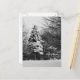 Cartão postal com foto de uma grande árvore de natal coberta de neve e as palavras Feliz de natal impressas ao lado dela. Personalizável para que você possa alterar ou remover o texto se quiser.