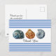 Este cartão postal estilo Praia apresenta três conchas marinhas em um fundo listrado azul e branco. Há um espaço para um cumprimento. Compre como mostrado com o cumprimento de agradecimento ou adicione seu próprio texto, como "Salve a Data" ou "Feliz Aniversário". A escolha é sua. Há um cumprimento no verso que pode ser personalizado com suas próprias palavras.