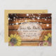 Este cartão postal de salvar a data rústico apresenta um fundo de tábua de madeira com bela caligrafia e girassóis vintage.
