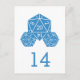 Casar-se com seu futuro cônjuge e tudo que levou ao noivado pareceu como se você tivesse rolado um vinte? Se sim, este cartão-postal geek chic D20 com número de mesa para casamento é perfeito para você! Com um dado D20 de vinte lados maior e dois dados menores ao lado, este cartão de mesa elegante e nerd em azul real é fácil de personalizar com os detalhes do seu casamento. Clique em "Personalizar" para encontrar mais opções de personalização.