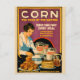 Cartaz mostrando uma mulher servindo muffins, panquecas e grits, com recipientes na mesa etiquetados como farinha de milho, grits e hominy. Texto: Milho - o alimento da nação Sirva de alguma forma em todas as refeições - apetitoso, nutritivo, econômico. Melhorado digitalmente para impressão de alta qualidade em tela. Publicado em 1918. Imagem da Biblioteca do Congresso.