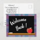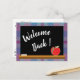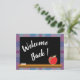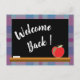 Um cartão postal simples, mas eficiente para dar as boas-vindas aos seus alunos de volta às aulas este ano. A frente tem um quadro negro com um pouco de giz branco e uma maçã vermelha. O fundo é um padrão xadrez azul e roxo. No verso está o texto com todas as informações necessárias para o primeiro dia de aula. Personalize-o usando o modelo. Há também um espaço para o nome do professor e o número da sala.