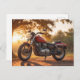 Este cartão postal apresenta uma motocicleta no campo no final da tarde.