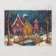Uma cena de Natal de arte ingênua e caprichosa que apresenta uma encantadora ponte arquitetada atravessando um riacho que flui suavemente. A neve mantinha a paisagem, com casacos confortáveis espiando as árvores ao fundo. Ao longo da borda da água e perto da ponte, as árvores altas de Natal ficam orgulhosas, enfeitadas com bolhas coloridas e luzes cintilantes. A cena brilha com um espírito quente e alegre de feriado.
