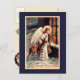 Este cartão-postal de natais vintages mostra um anjo do céu com um veado carregando presentes de Natal olhando pela janela na véspera de Natal para trazer paz e boa vontade.