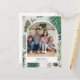 Cartão com fotos de férias pintado à mão com uma saudação personalizada ao lado de uma ilustração da floresta do inverno.