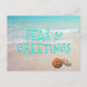Os mares e saudações, cartões postais de férias com a cena da praia e os conchas. Todas as palavras, frente e verso são fáceis de mudar ao seu gosto. O texto da sombra azul-aqua brilhante é impresso sobre a água do oceano tropical. Enviem saudações ao barato de um clima quente.