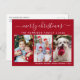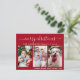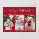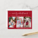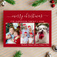 Cartão-postal vermelho simples, com 3 imagens de colagem e "Feliz Natal", escrito em um roteiro branco de na moda com baloiços. Adicione o nome da família, os nomes e o ano.