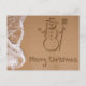 Ilustração de Natal ensolarada com um boneco de neve e Feliz Natal escrito na areia na praia ao lado do oceano.
