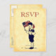 Cartões postais de RSVP Personalizados com letras em marrom e vintage Americana 4 de julho de arte com um rapaz patriótico segurando fogos de artifício vermelhos e uma antiga bandeira dos EUA em um fundo faux parergergs. Este modelo tem cartas de vintage para informações de RSVP, endereço de devolução e do planejador e data de resposta. Clique em Personalizar para alterar fontes, cores, dimensionamento e muito mais, até salvar seu design para mais tarde.