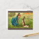 Este cartão postal do estilo vintage adorável mostra uma garota e um coelho interagindo, junto com uma saudação Páscoa