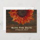 Um cartão de salva data de casamento com uma imagem de um girassol espreitando do topo da frente sobre um fundo de madeira de celeiro. Personalize o texto na frente e no verso.