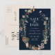 Cartão Postal de Salvar a Data Boho Azul Marinho. Este cartão postal de anúncio de salvar a data de casamento elegante e sofisticado apresenta belas flores silvestres pintadas à mão em aquarela, dispostas como um lindo buquê perfeito para casamentos de primavera, verão ou outono. Encontre itens correspondentes na Coleção de Casamento de Flores Silvestres Boho Azul Marinho.