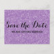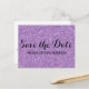 Cartão postal de salvar a data com brilho chique e elegante com um fundo de arte digital com aparência de brilho roxo. Fácil de personalizar com os detalhes do seu casamento. Para mais opções de personalização, clique no botão Personalizar. //BRILHO NÃO REAL - IMAGEM PLANA IMPRESSA DE ARTE DIGITAL//